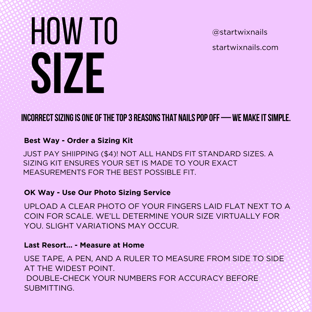 Every order is shipped with a return label to be used within 30 days of receiving shipment if necessary. If you experience any defects due to incorrect sizing or poor manufacturing, please email info@startwixnails.com. We will verify the claim and request use of the return label. DO NOT SHIP PRODUCTS BACK WITHOUT VERIFICATION OR WE RESERVE THE RIGHT TO CHARGE A SHIPPING FEE BEFORE RELEASING GOODS. Star Twix Nails reserves the right to deny, repair, replace, or issue store credit depending on the nature of the claim.