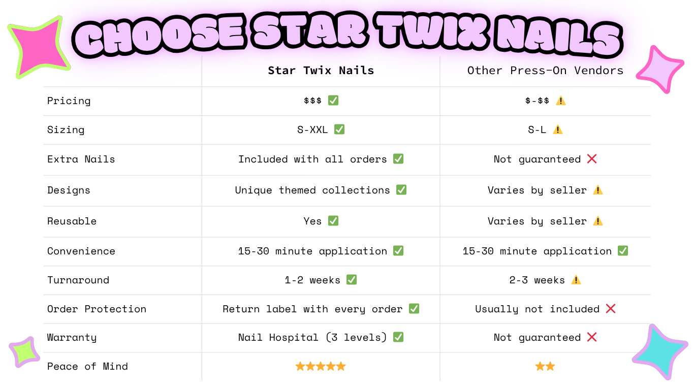 Every order is shipped with a return label to be used within 30 days of receiving shipment if necessary. If you experience any defects due to incorrect sizing or poor manufacturing, please email info@startwixnails.com. We will verify the claim and request use of the return label. DO NOT SHIP PRODUCTS BACK WITHOUT VERIFICATION OR WE RESERVE THE RIGHT TO CHARGE A SHIPPING FEE BEFORE RELEASING GOODS. Star Twix Nails reserves the right to deny, repair, replace, or issue store credit depending on the nature of the claim.